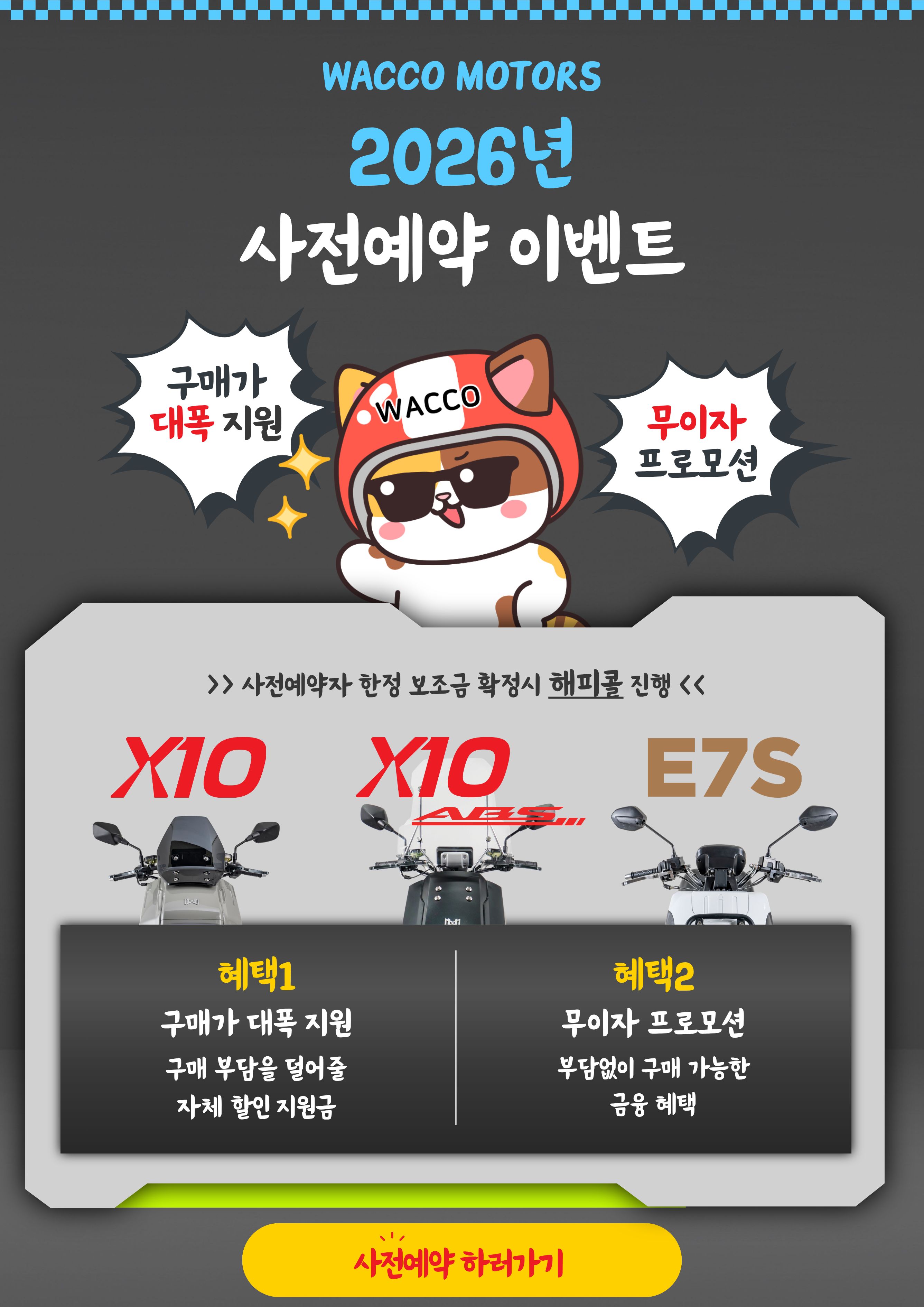 안녕하세요 와코 입니다. 고객 여러분의 성원에 보답하고자, 2025년 한 해의 마지막을 함께하는 "연말 세일페스타" 이벤트를 진행합니다. 이번 행사에서는 공유형 모델 (X10/X10A) 를 대상으로 정부 및 지자체 보조금 외에도 추가 할인 혜택을 제공하여 더 합리적인 가격으로 만나보실 수 있습니다. 다시는 없는 이 가격 놓치지 않으시길 바랍니다!!!! * 공유형 (X10 / X10A 가격 안내) 구분 X10 공유형 (서울기준) X10A 공유형 (서울기준) 일반 배달,소상공인, 취약계층,장애인 일반 배달,소상공인, 취약계층,장애인 소비자 가격 4,900,000 5,400,000 정부 보조금 1,360,000 1,460,000 프로모션 할인 1,800,000 2,287,000 서울시추가보조금 304,000 626,000 319,000 661,000 와코 카카오톡 친구추가 할인 300,000 300,000 최종 실 부담금 1,136,000 814,000 1,334,000 992,000 * 위 가격 테이블은 서울시 기준이며, 지역별 보조금이 상이할 수 있으므로, 카카오톡 채널상담 및 유선 상담을 부탁드립니다. * 프로모션 할인에 대한 내용은 KOOROO BSS 무제한 요금제 1년 OR 2년 약정 기준으로 적용됩니다. * 본 프로모션은 사정에 의하여 사전 공지없이 중단될 수 있습니다. 다시는 없는 기회 ! 꼭 놓치지 마세요 !!